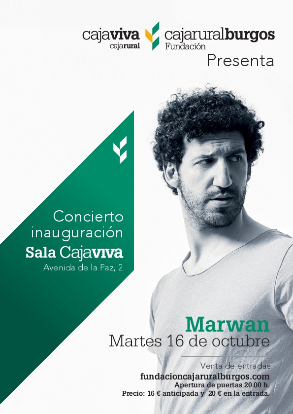 El próximo 16 de octubre el cantautor Marwan ofrecerá un concierto en acústico inaugurando la Sala Cajaviva de Burgos situada en la Avenida de la Paz, 2. En él presentará su cuarto disco “Mis paisajes interiores”.